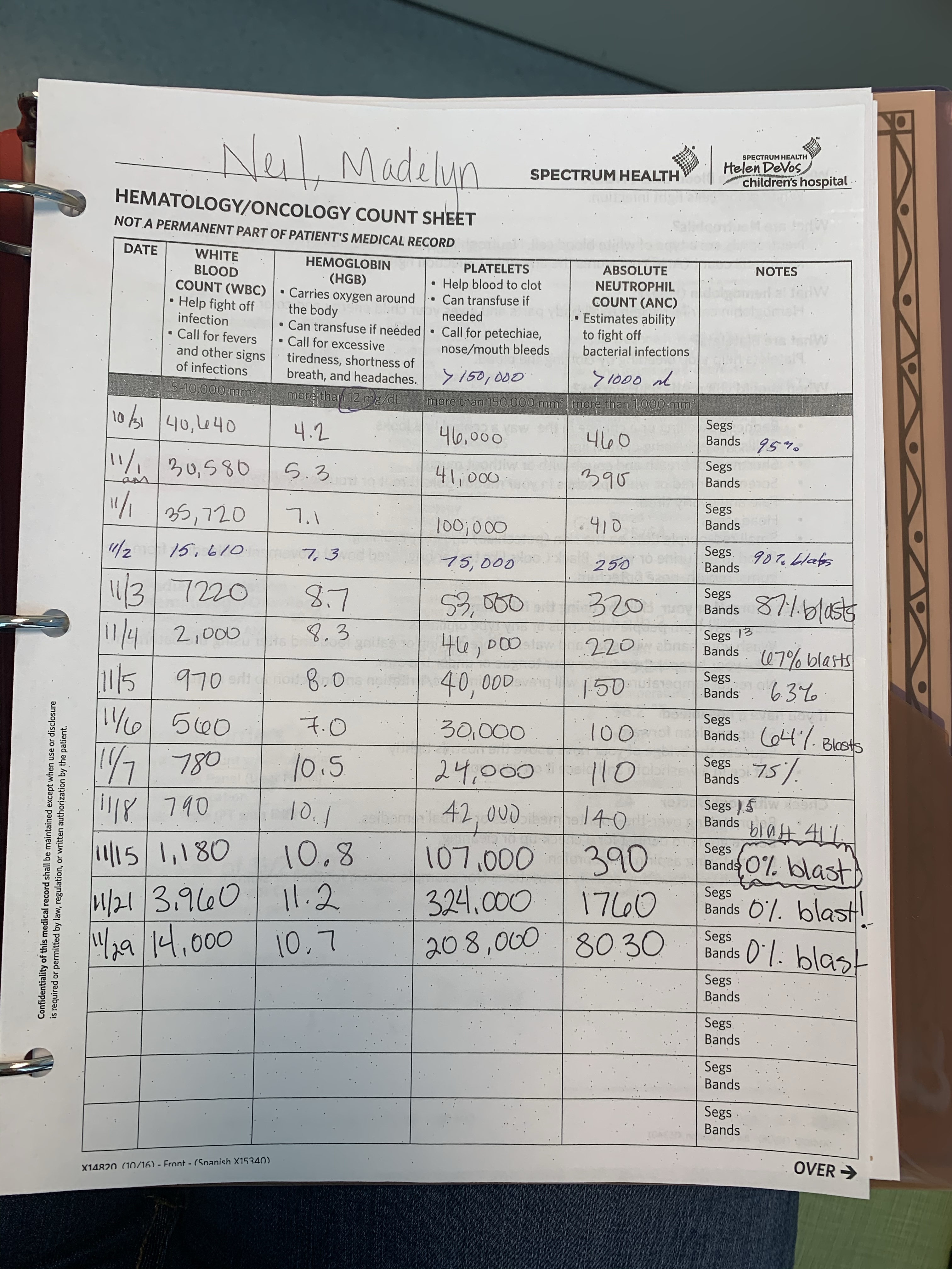 We now have one week at home under our belt. We also did our first “clinic” visit to DeVos yesterday. Madelyn had her port accessed for the first time. Basically like getting an IV in your arm but they put the little needle in the port that is under her skin on her chest. There is a picture of the port in her “Hospital Book” under the information tab on her site if you want a visual. She was very nervous. She is a kiddo that really likes to know what is going on so we talked through it at least 10 times the 24 hours before. They gave us magic cream (Lidocaine) to put on during our drive to Grand Rapids. It did the trick and numbed her skin. She was still scared but I don’t think it hurt too much. The hardest part was taking off the Tegaderm sticker that was holding the lidocaine on her skin. The first thing they did once we got her port accessed was draw labs and run her numbers. Brad and I have been anxiously waiting for these. In the hospital you get these numbers every morning and it’s a big part of your daily routine. So going without them for a week was challenging and a bit scary just not knowing. Well, Madelyn’s numbers came back better than we had hoped!