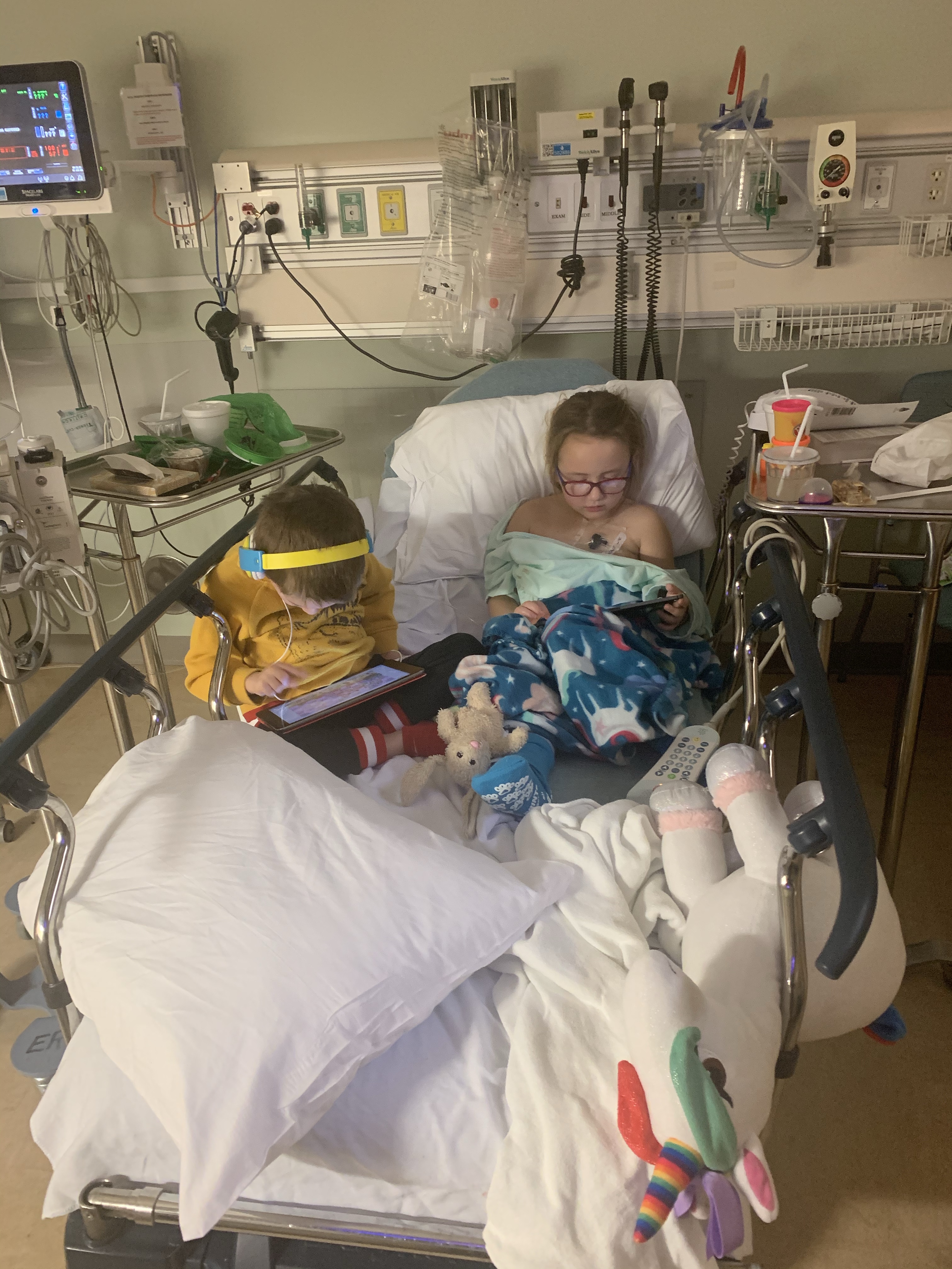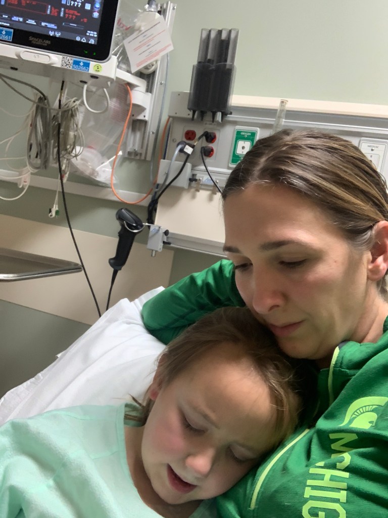 Brad brought mom a coffee and joined us on the couch. We just booked our new dates for our Florida trip (to fit into her chemo schedule) the night before so we told the kiddos and spent an hour all googling and watching you tube videos of water parks in Orlando and Tampa. The kids were so excited! The sun was out which really makes us northern Michigan folks excited in the winter so we were ready to face the day! Madelyn has been nauseous since her chemo on Friday so we were wrapping our heads around the battle we would have with morning meds. Mom gave Madelyn a kiss on the forehead. A new norm for mom and dad to check for temps, and she felt warm. Took her temp.. 102.6.. we always take it twice. Once on each side of the tongue. Both in the 102 range. Panic set in… Brad could read it in my face so then we were both in panic mode. Our nice morning, of how could we go enjoy this sunshine before our ski lessons just turned to this is going to be a long crappy day that we hope doesn’t escalate to anything serious. Protocol is to call DeVos with a temp of 101 or higher. So as I have the phone to my ear I’m looking for the lidocaine and press n seal wrap that I know they are going to make me use on her. Madelyn starts crying when she realizes the lidocaine is out. She knows that means she is going to get poked and she wants to know where and how many times. I stop and sit with her trying to get her to quiet while I’m talking to an operator then the on-call oncologist. Sure enough, they want lidocaine on both arms and her port. They call the ER at Munson to let them know we are coming so we don’t have to wait with all the sick people in the waiting room. In the mean time Brad has already predicted we’re headed to the ER and is packing our go bag with all her meds, paper work, iPads, card games and snacks. Parker is confused and not a fan of us running around telling him to get ready to get out the door and Madelyn is still crying. We somehow manage to get everyone in the car. The closer we get the more she cries. She hates being poked and she knows she’s going to get at least two. When we get there we mask everyone up. Last thing we need to to catch RSV or the flu! I demand no one touches any surfaces until we get registered and in the room. That is where we spend the next 6 hours. Which included accessing her port, blood draw from her arm, chest x ray, nose swab for the flu, 2 rounds of IV antibiotics, vomiting up our AM oral meds that we finally got around to taking, mom begging to have those meds delivered via IV, and IV Tylenol since we didn’t want to force her to attempt oral meds again and vomit. We had had enough. Parker was bored by this point however he did amazing considering how long we were there. All the test came back good. We are still waiting on two blood cultures if those are negative I believe we are chalking it up as a reaction to her Chemo or fighting a virus. We were finally going to head home. But not before we have to remove the large tape on Madelyn’s chest and pull the butterfly iv from her port. This part really sucks and always makes her cry.