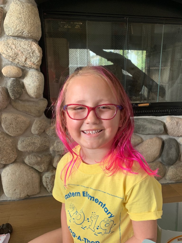 So how has the last 45 days gone I’m sure you’re asking yourself by now… We quickly re-remember that the steroid is a powerful drug. Madelyn got her eating itch back and fast weight gain (only about 6 lbs. this time but still a huge %). Waking up at 3am and being wideawake was normal again. About a month ago, she started losing a lot of hair. We thought for sure it was finally coming out. Madelyn loved the idea to color her hair pink, so mom bought the permanent hair dye. What nobody told us is that as quickly as she was losing it, she could also go back to not losing it. She currently is very thin (she did get that from her dad) but loving and rocking the pink hair. At this point, it looks like a coinflip if she loses it all or not.